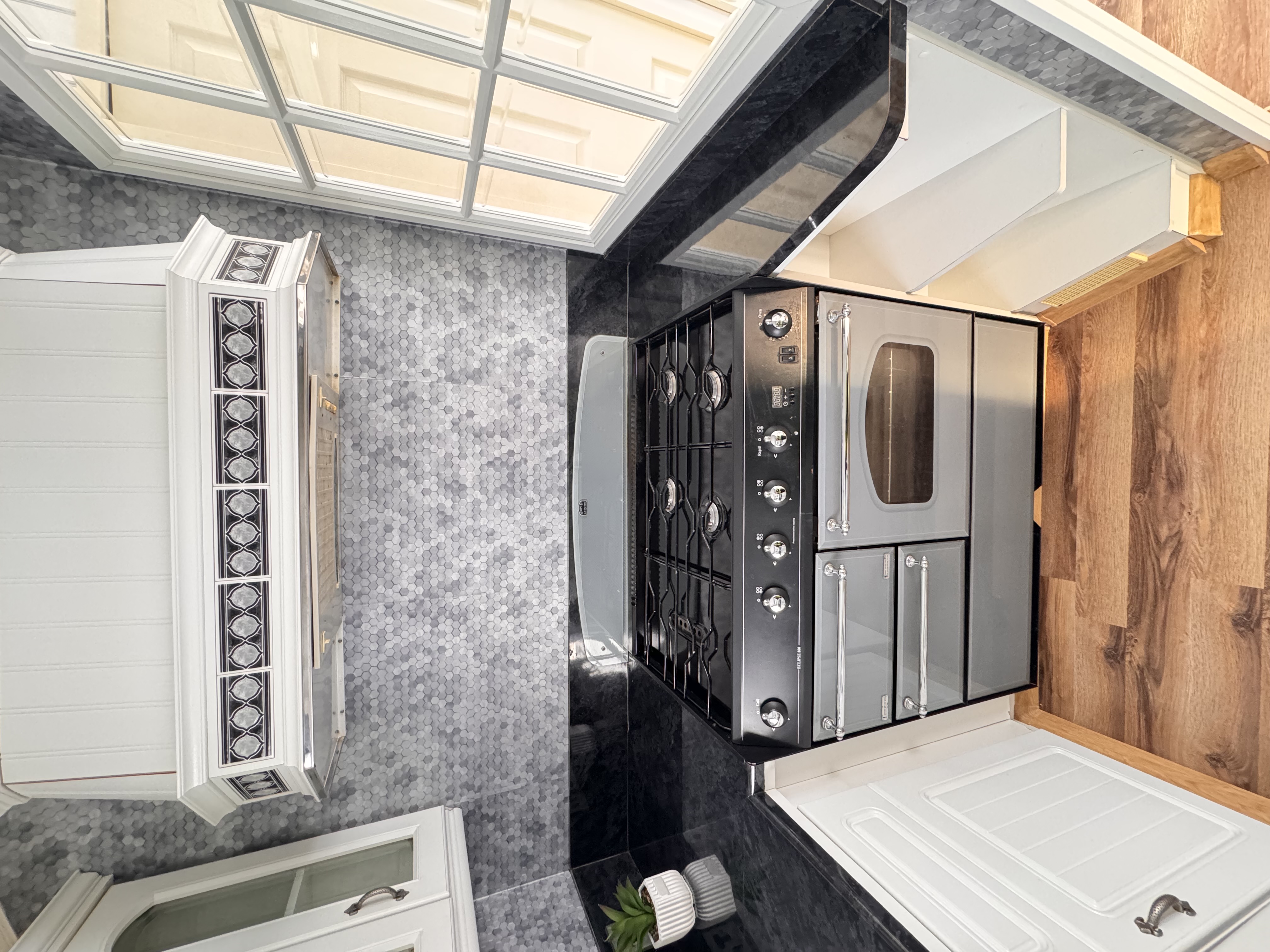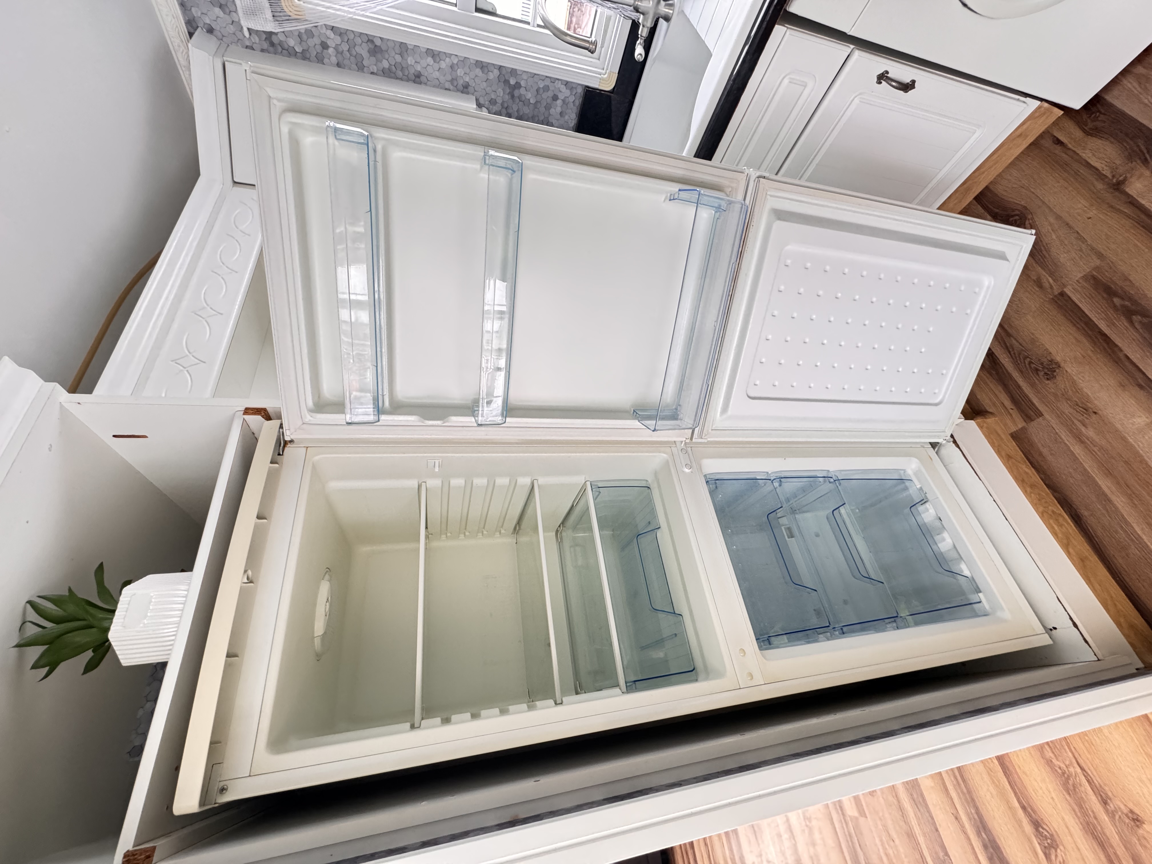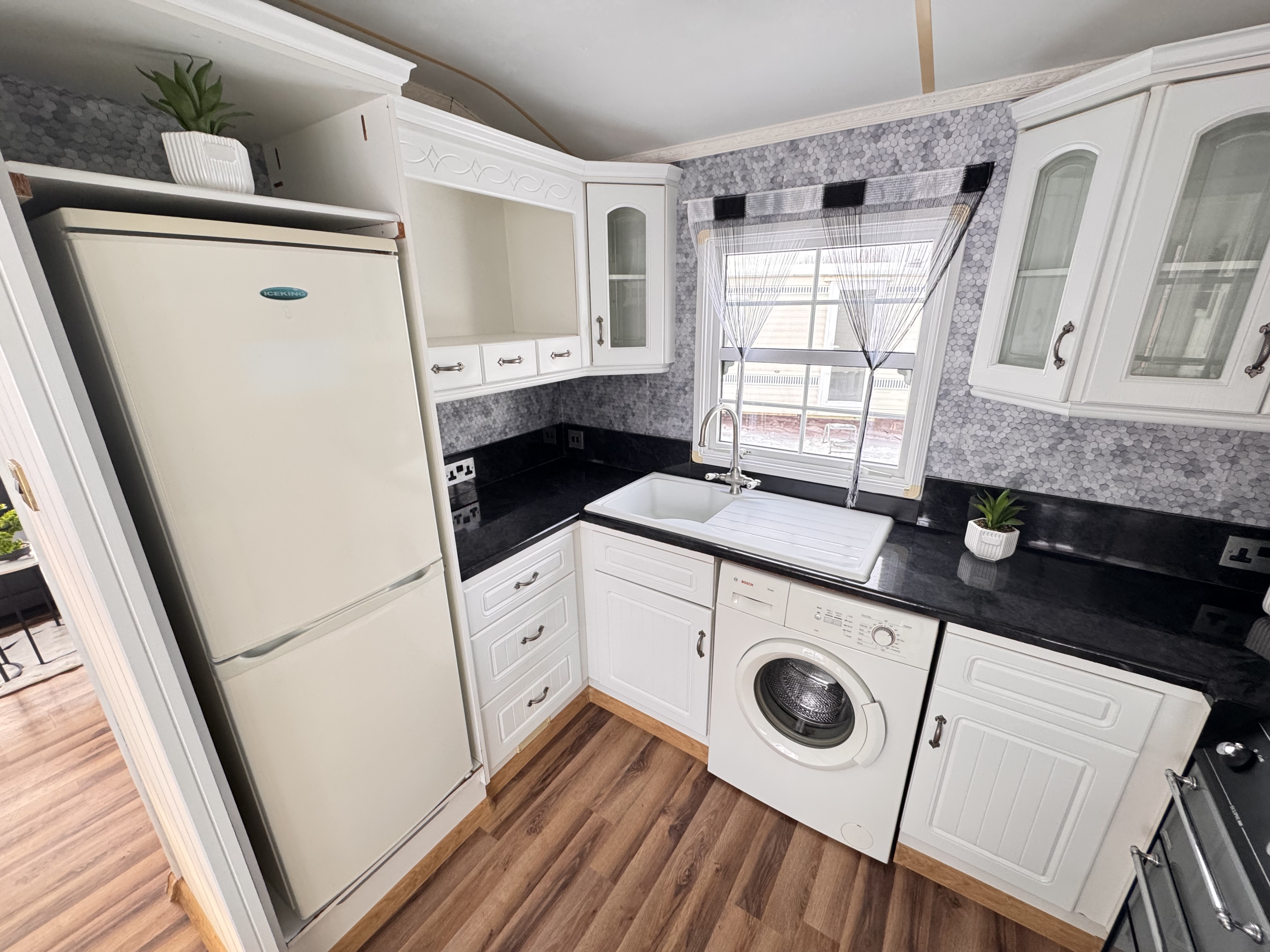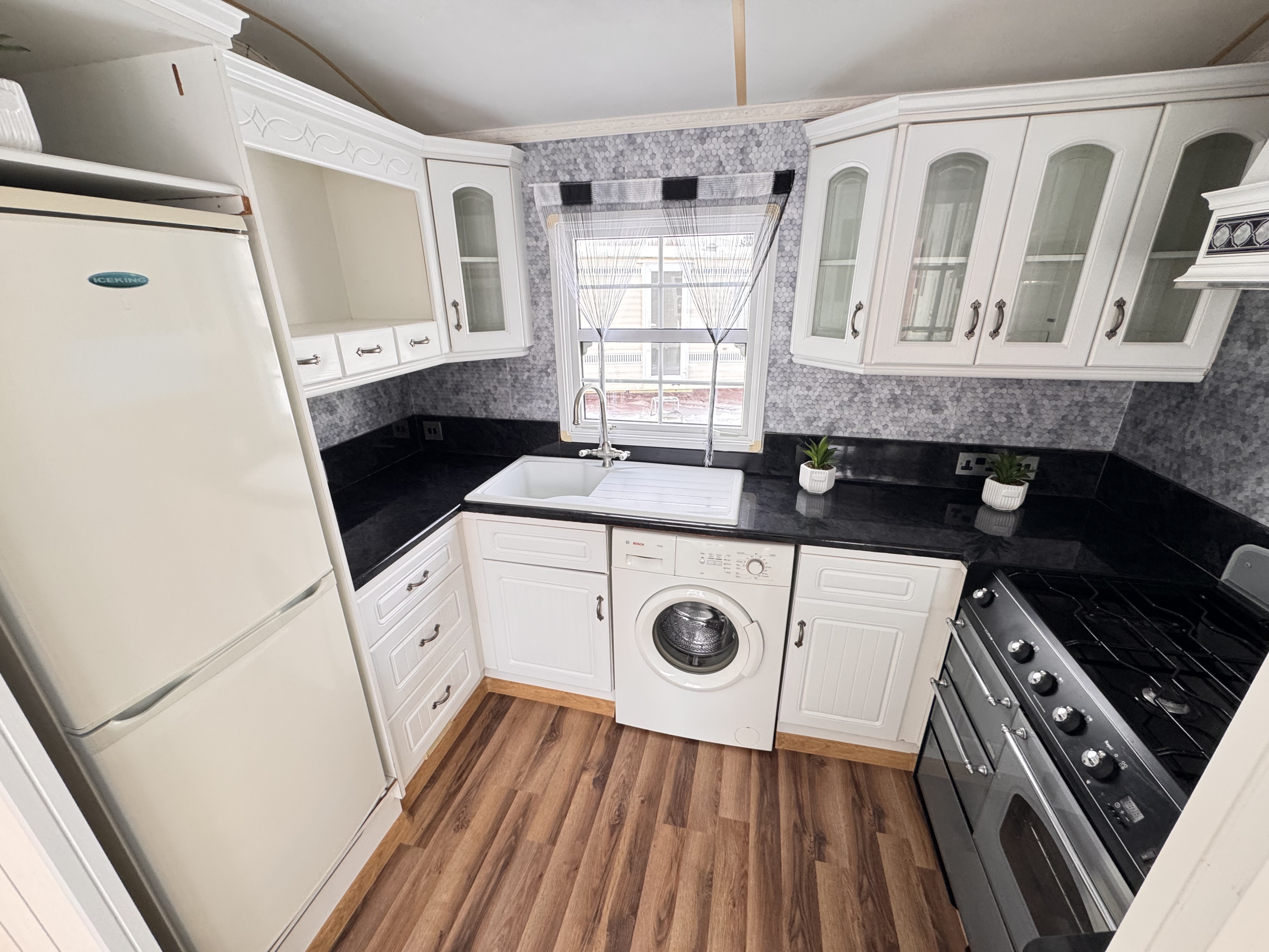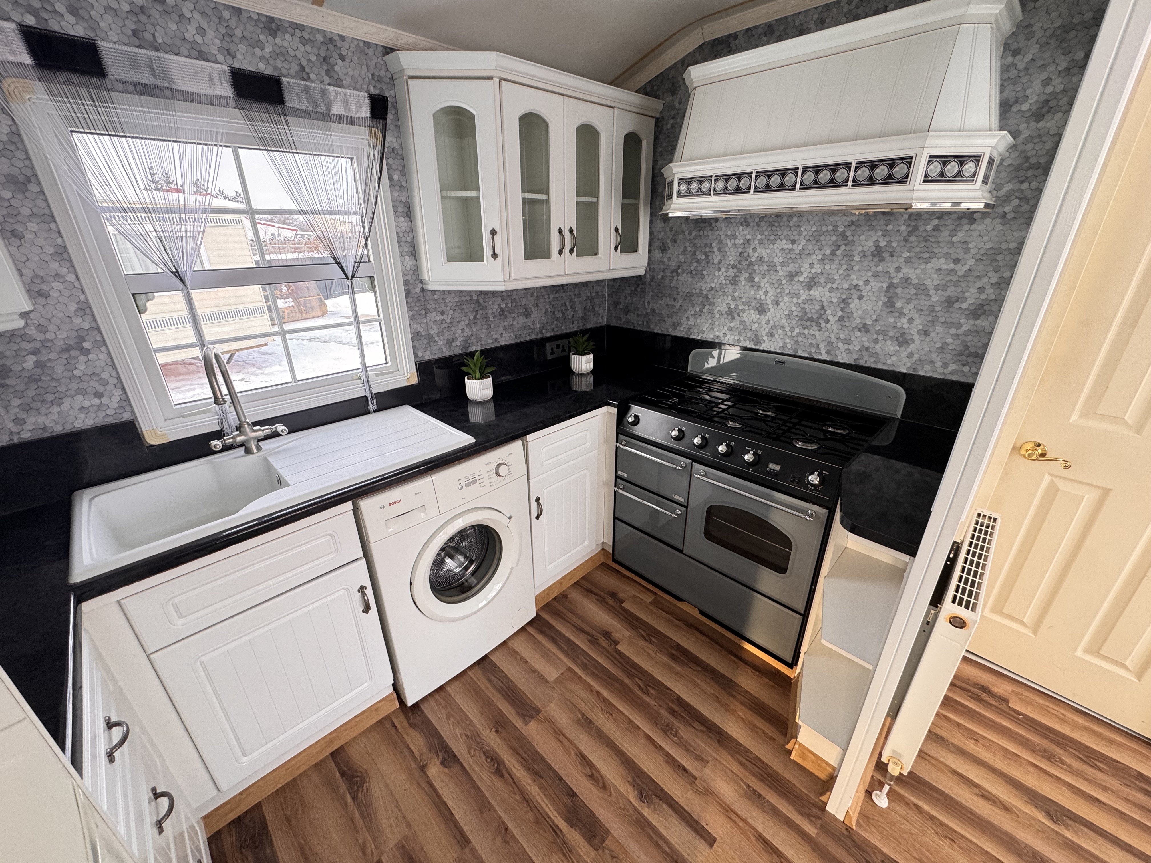 -KUCHNIA : meble , kuchnia gazowa 4 palnikowa z potrójnym piekarnikiem , lodówka z zamrażalnikiem , pralka ,pochłaniacz elektryczny