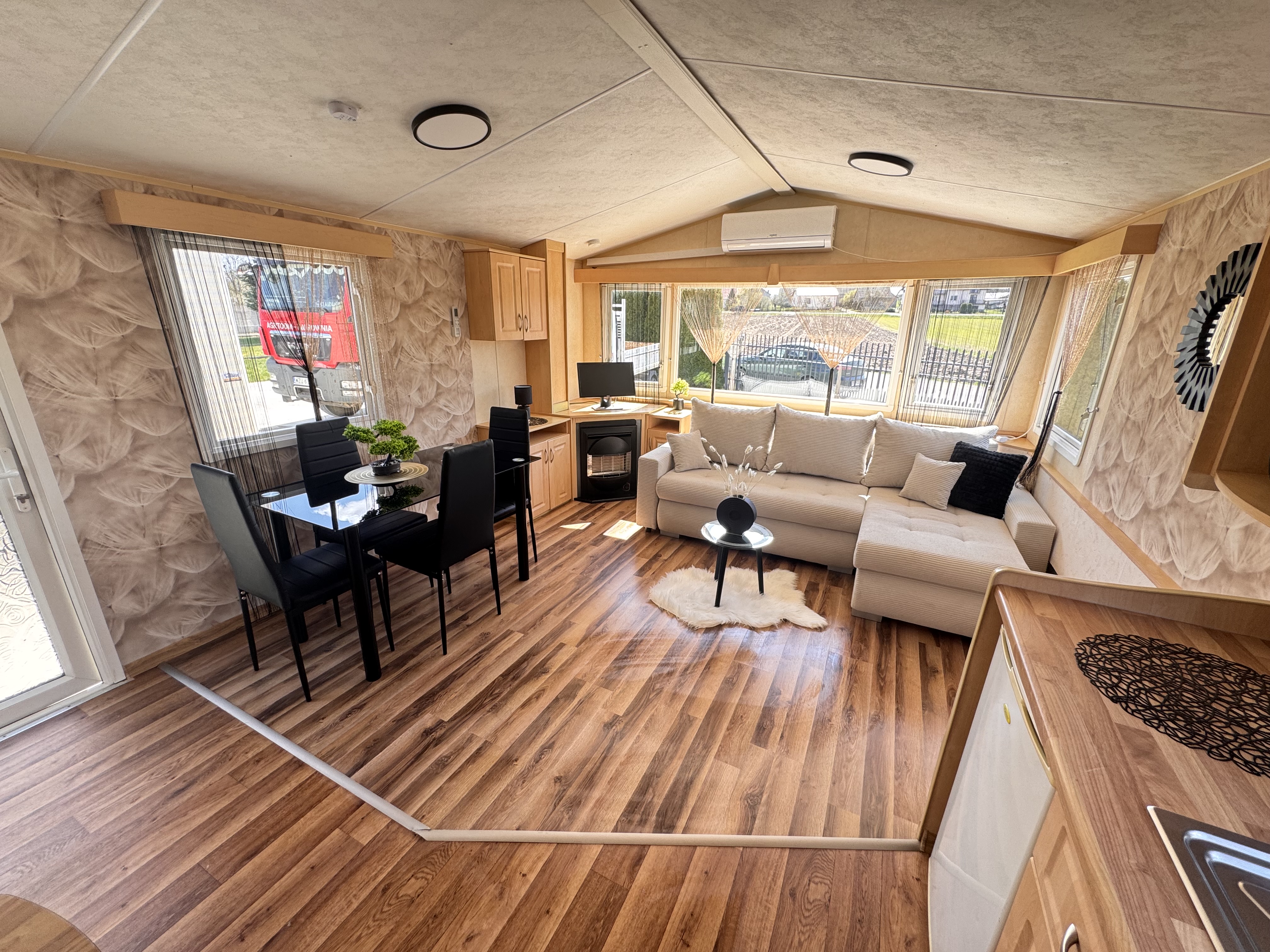-SALON : NOWA kanapa z funkcją spania , stolik , szafki , meble , kominek gazowy , klimatyzacja ‼️